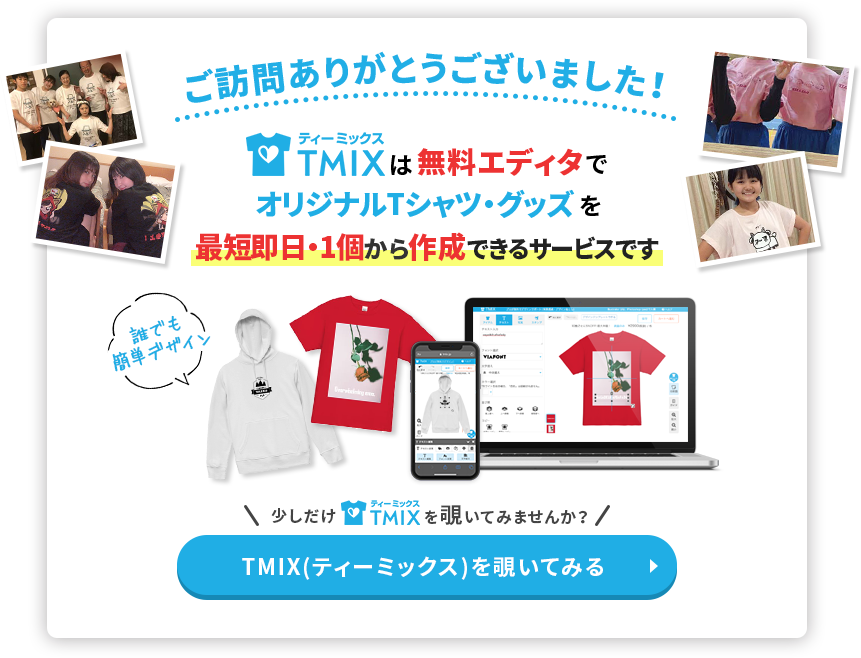 Tシャツの種類やサイズ、プリントの大きさ、価格などを知りたい方は、TMIXのアイテム一覧からアイテムを選んで詳細ページをご確認ください。プリントの質について知りたい方は、オリジナルTシャツのプリントについてをご確認ください。
