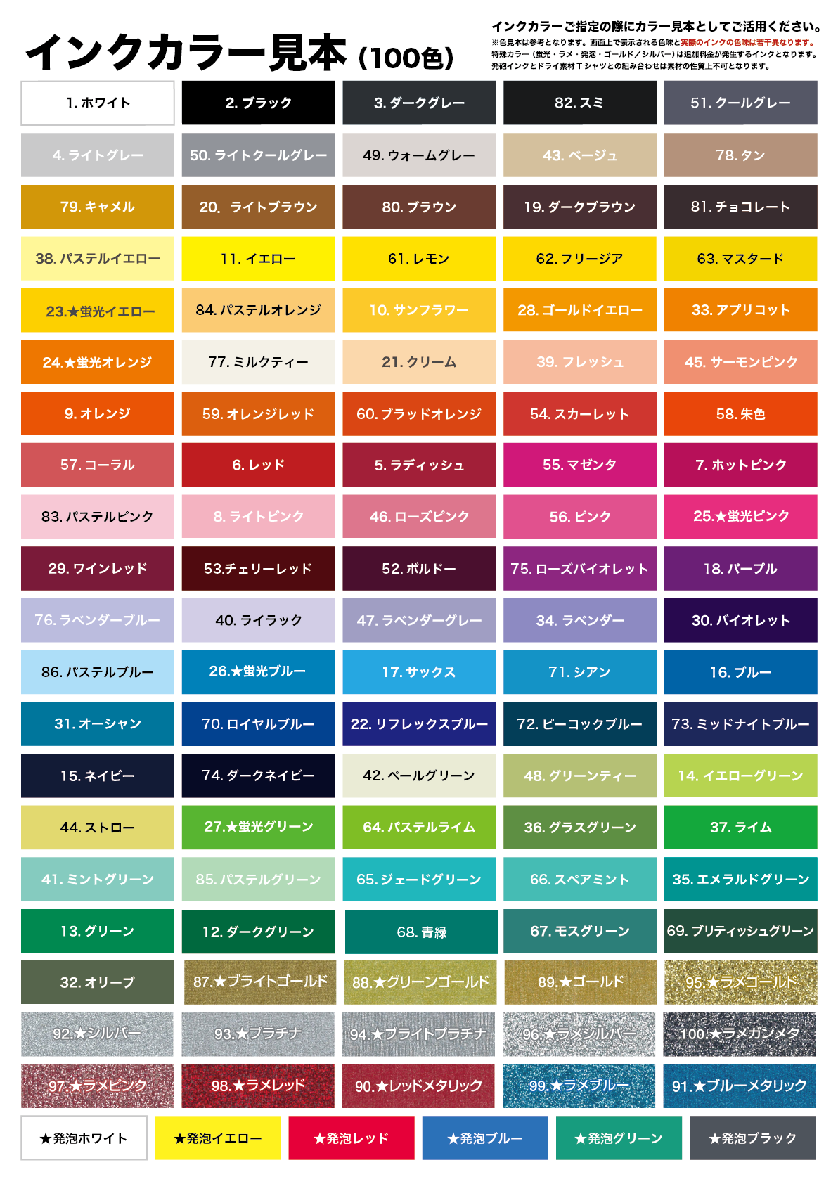 シルクプリントでは、基本的にはこちらのカラー見本を参考に色をご指定いただくようになります。蛍光色やラメ入りなど特殊なインクをご希望の場合はお見積りの際にご相談ください。